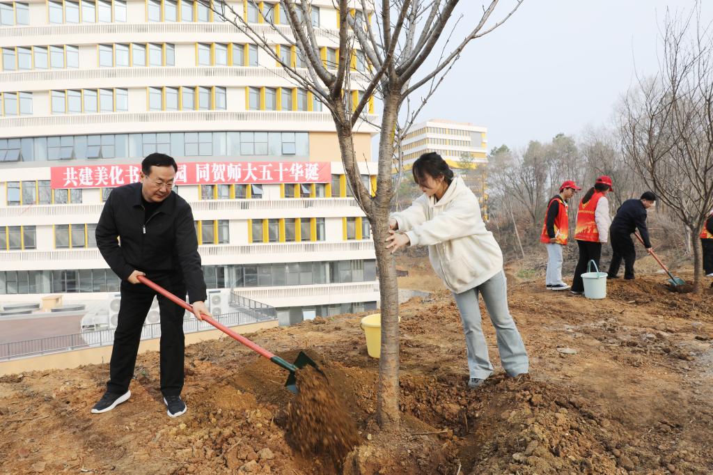 活动现场,校领导和师生代表挥锹铲土、扶苗培土、提水浇灌,共同栽种晚樱、榉树等160余株景观树木。师生们热情高涨、意气风发,新栽树苗绿意盎然、亭亭玉立,为春日校园增添了勃勃生机。