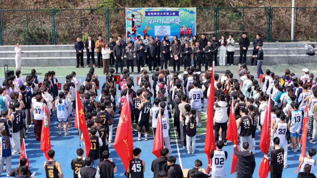 活动伊始,岳宗德同各单位领导教师莅临现场,为青年学子加油鼓劲,为开幕式和比赛的顺利进行送上美好祝福。随后,全体师生肃立齐唱国歌,运动员代表刘璜颖带领全体球员进行集体宣誓,裁判员代表王毅承诺,全体裁判员将全程恪守“公平、公正、公开”原则,严格遵照赛事规程,坚决贯彻裁判工作方针。体育学院院长余道明发表致辞,他鼓励参赛队伍积极进取,贯彻友谊第一,比赛第二的体育精神,让“谭山杯”成为我校学子弘扬体育精神、培养团队意识、锤炼意志品质的课堂。体育学院副院长牛林杰宣布信阳师范大学第二届“谭山杯”篮球赛正式开幕。
