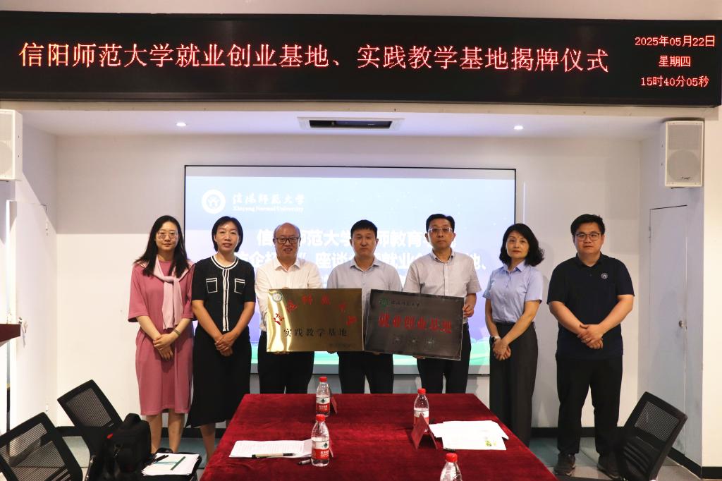 李文田、潘登代表教师教育学院与信阳市科技馆分别签订了实践教学基地合作协议书、就业创业基地合作协议书,授予“信阳师范大学教师教育学院实践教学基地”“信阳师范大学就业创业基地”牌匾。