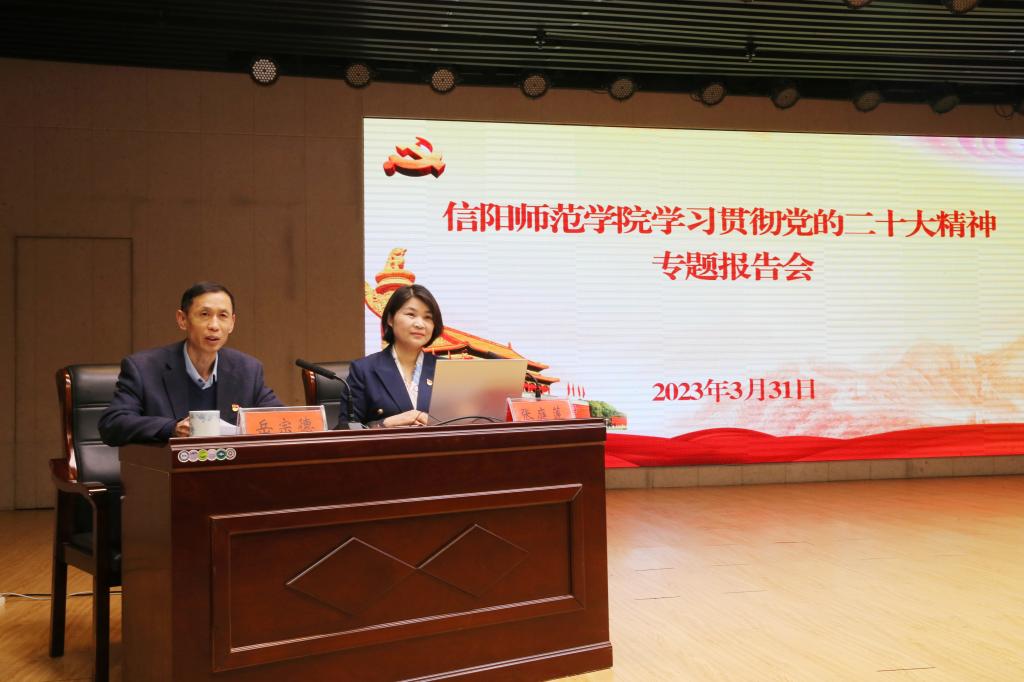 3月31日,校党委理论学习中心组(扩大)举行党的二十大精神集体学习专题辅导报告会,党的二十大代表、平桥区龙井乡南雷村支部书记兼村委会主任、信阳农林谷公司创始人张庭莲同志应邀作专题宣讲报告。校党委理论学习中心组全体成员、全体处级干部和思政课教师、专职辅导员、学生代表共同聆听了报告。报告会由校党委副书记、工会主席岳宗德主持。